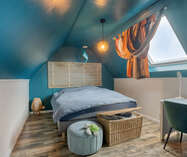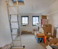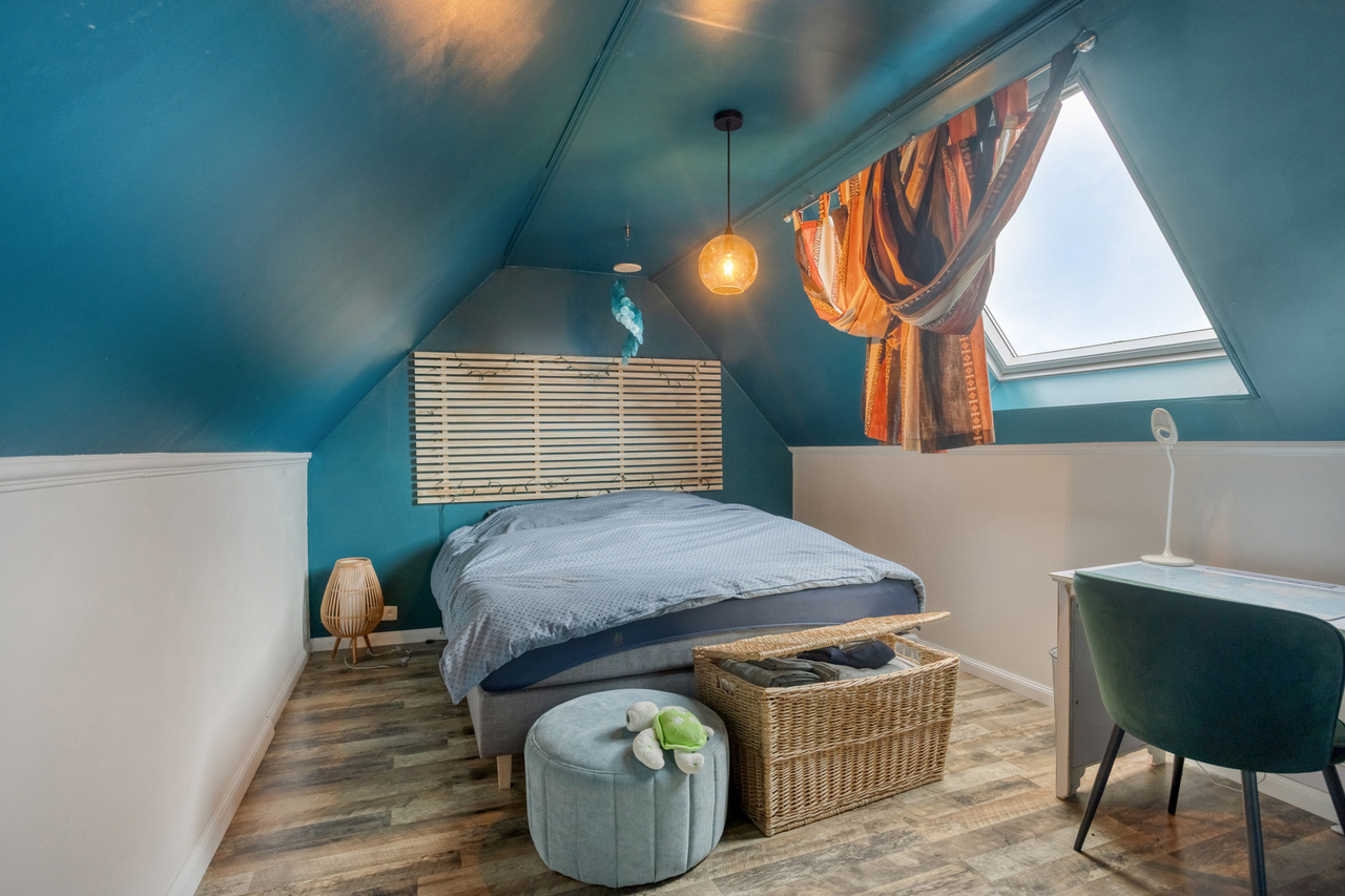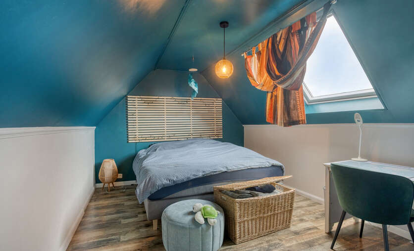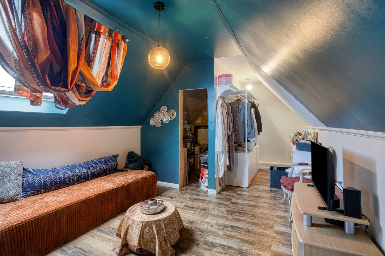 À l’étage se trouvent deux chambres spacieuses ainsi qu’une pièce supplémentaire pouvant servir de bureau ou de dressing et donnant accès à la chambre aménagée dans les combles.